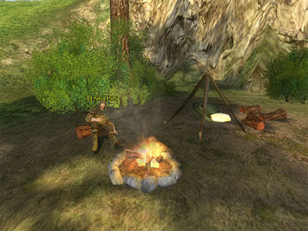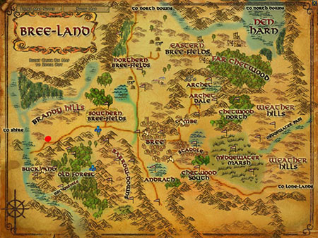 Strider is proud of you and wants you to find out any information you can about the four missing Nazgul. He sends you to Lenglinn's campsite. You will want to travel west out of Bree from the main gate. Follow the road past Adso's Camp. Continue along the main road heading towards Buckland. But before you get there take a look at your map. Do you see where it says "to shire" on the western edge of the map? Good, now locate the mountains to the east and a little south of there. Right there you will see that the road you are traveling on dips south. When you reach the spot where the map dips south, head north into the mountains. Through some trees and up the hill you will find a small camp with Lenglinn the Ranger waiting for you.